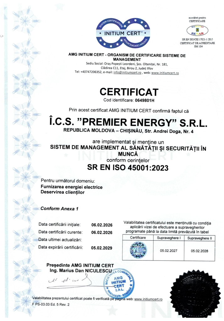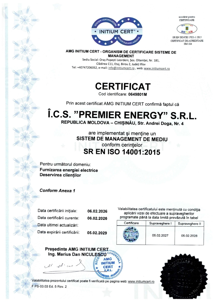 În conformitate cu normele din domeniul de certificare, parcurgând cu succes toate etapele de audit extern realizat pe parcursul anului 2019 de Societatea Română pentru Asigurarea Calității, selectată în baza unui concurs internațional, ÎCS „Premier Energy” SRL a primit în februarie 2020, certificatele care confirmă că întreprinderea a implementat și menține un Sistem de Management al Calității, Mediului Ambiant și Sănătății și Securității Ocupaționale, conform condițiilor din standardele ISO 9001:2015, ISO 14001:2015 și ISO 45001:2023, cele mai înalte și riguroase, apreciate la nivel internațional.