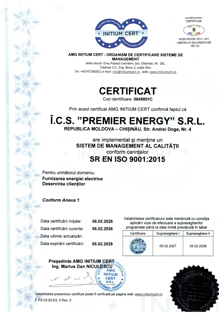 ÎCS „Premier Energy” SRL implementează constant cele mai performante sisteme de gestiune și aplică practici internaționale pentru îmbunătățirea continuă a serviciilor prestate clienților săi.